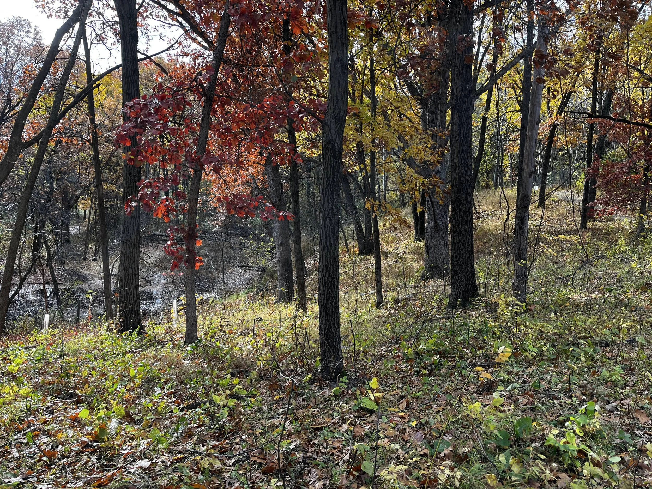Oak woodland in Minneapolis after successful removal of buckthorn and excessive woody encroachment. A dense diverse herbaceous ground layer is just beginning to form.