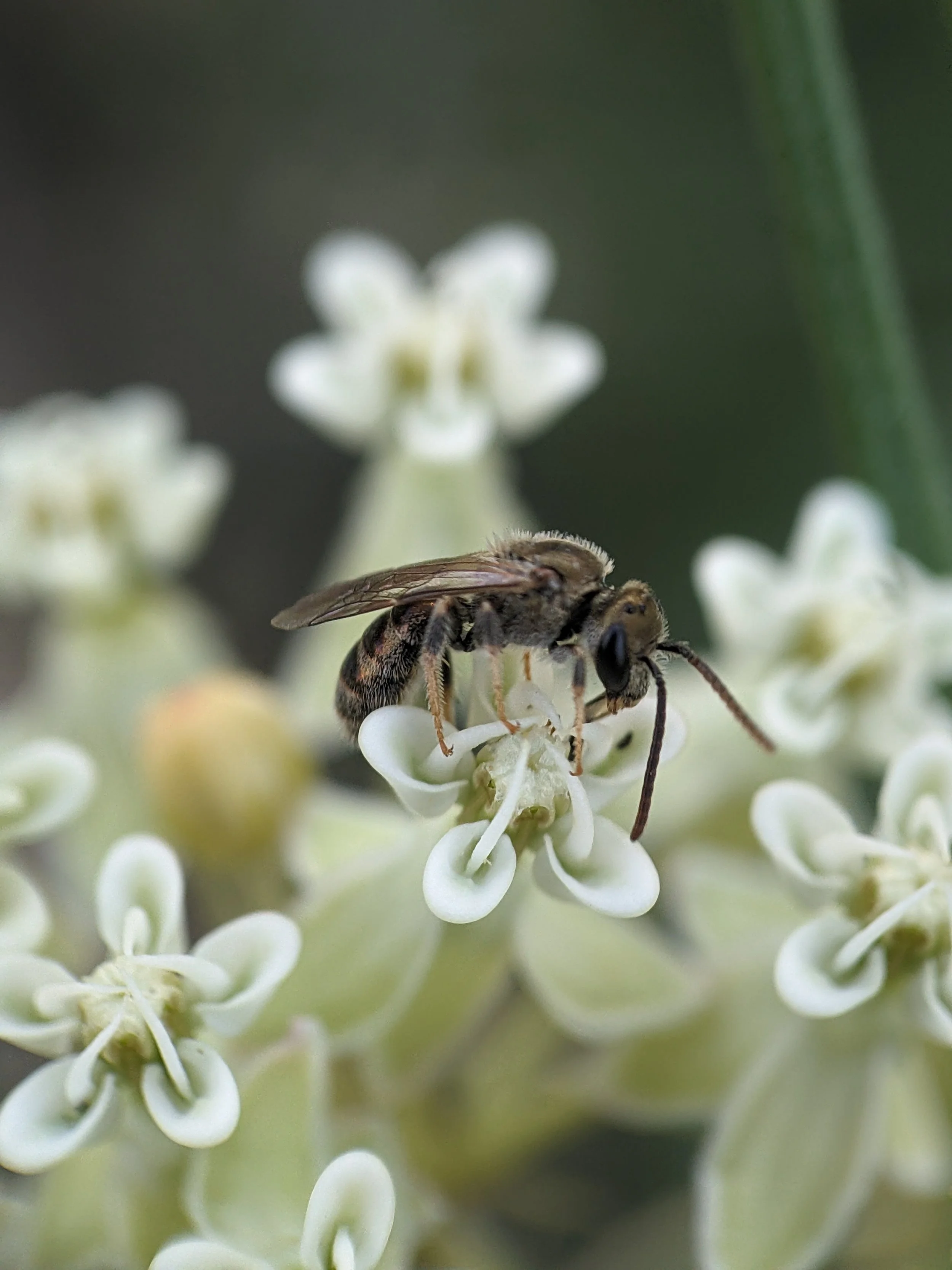 A small native bee on whorled milkweed flowers.