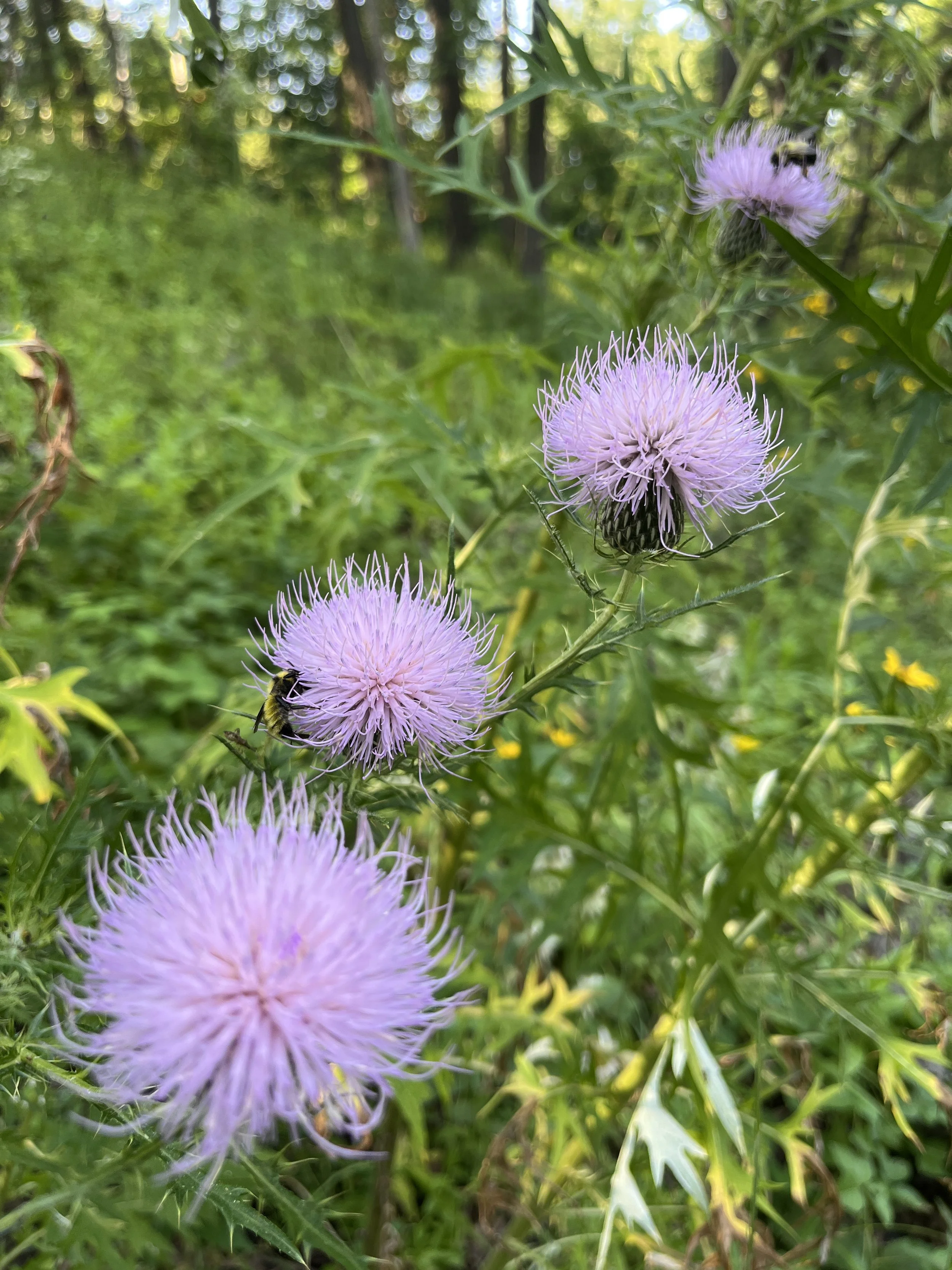 Native thistle flowers after successful removal of invasive shrubs.