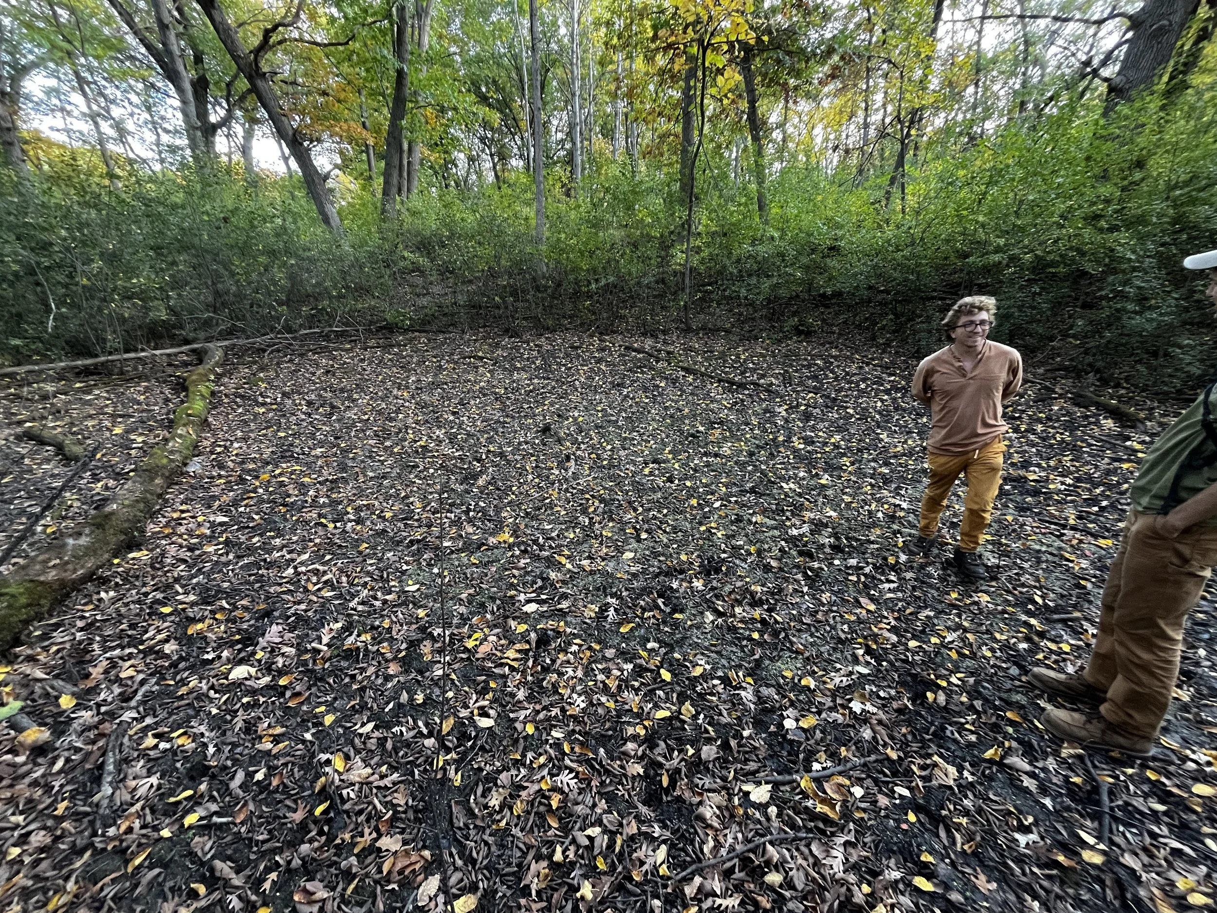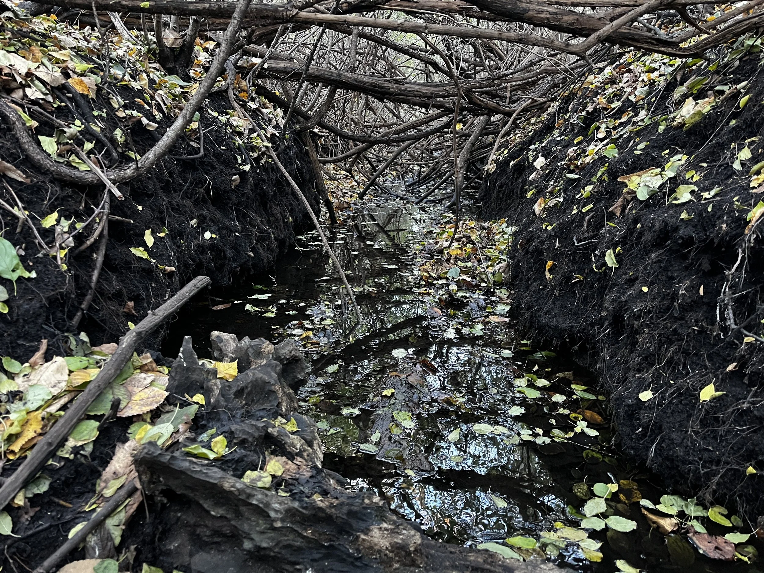 A carbon sink degrades in Wirth Park: eroding peatland gully with buckthorn debris and dense buckthorn regrowth.
